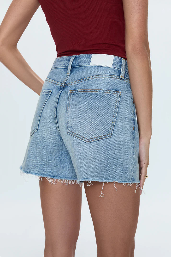 Meet the Andie: Your new favorite high-rise cut-off shorts. These rigid denim shorts offer a relaxed, yet flattering fit and a perfectly vintage feel. The light medium wash and raw hem add a touch of cool, making them perfect for any occasion.