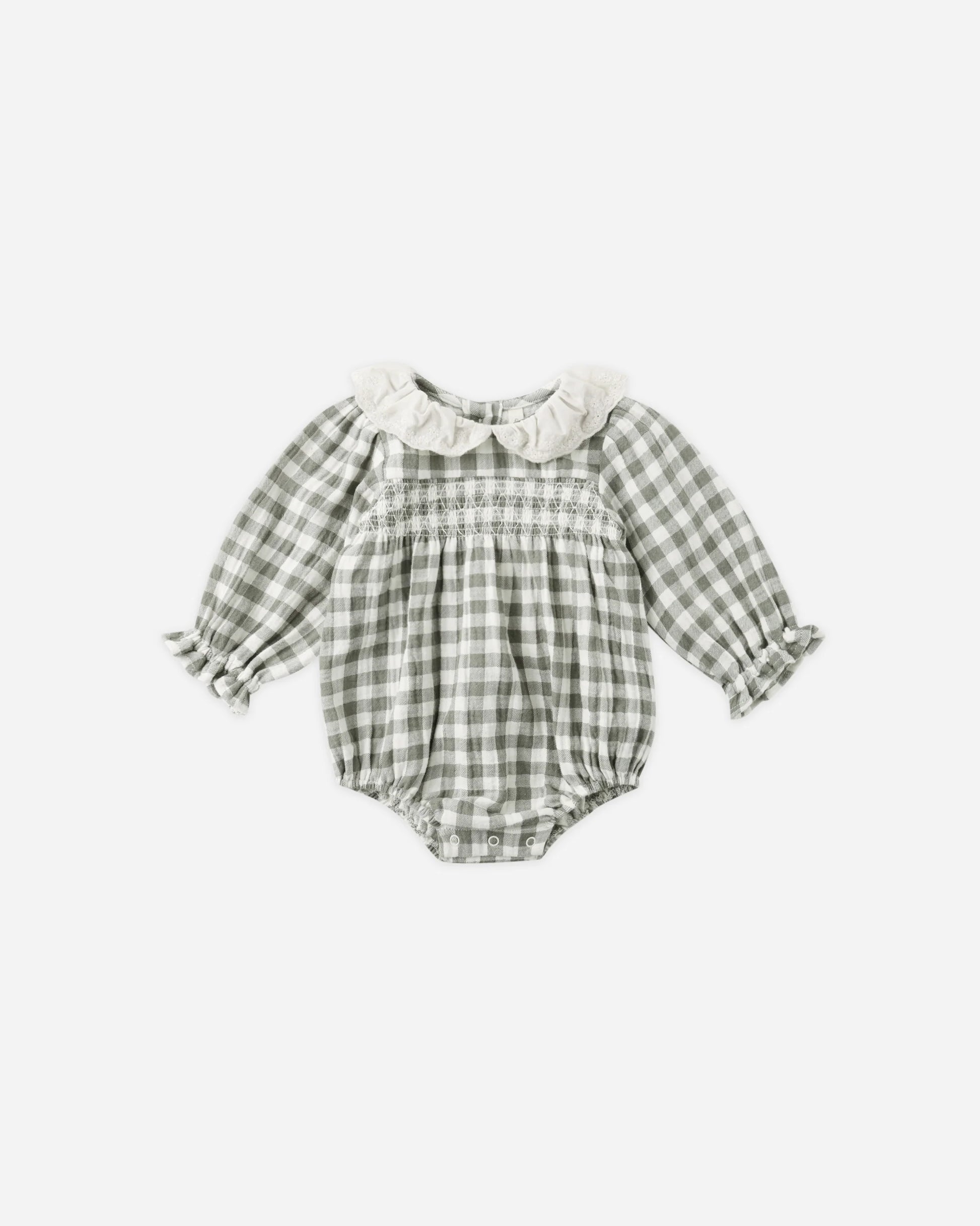Our Callie Romper features a sweet embroidered collar, smocked front, and gathered long sleeves. Buttons at the back and snaps at the bottom make for easy dressing.