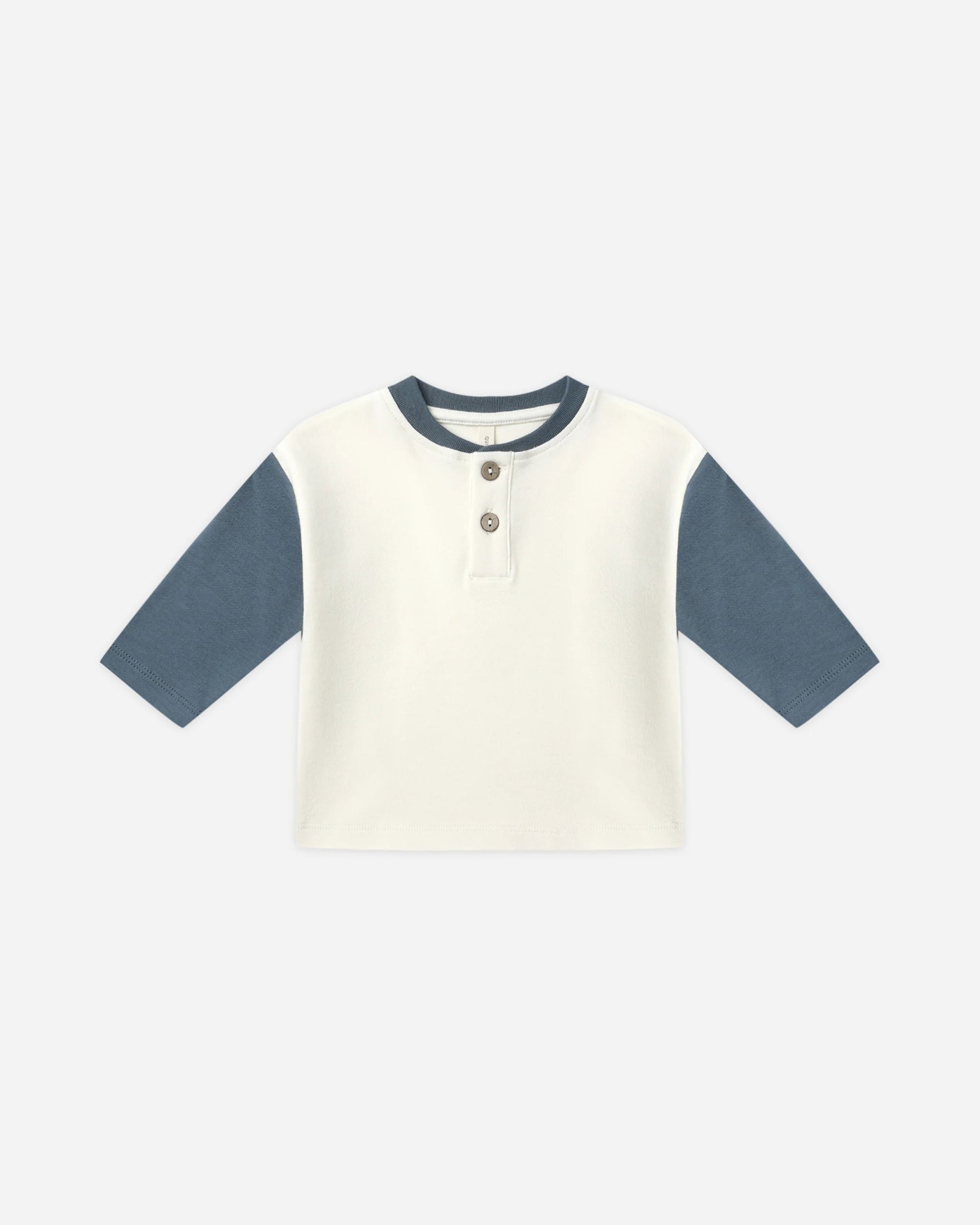 A cozy long sleeve tee with a relaxed fit, featuring contrast sleeves, neckline, and front placket, with soft coconut buttons for easy changes. Drawstring pants with an elastic waistband, crafted from our soft organic brushed jersey fabric for all-day comfort.