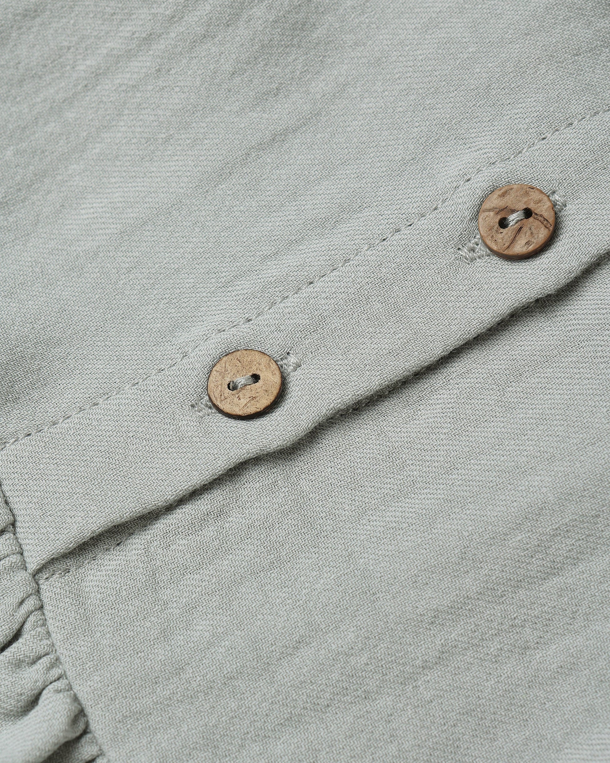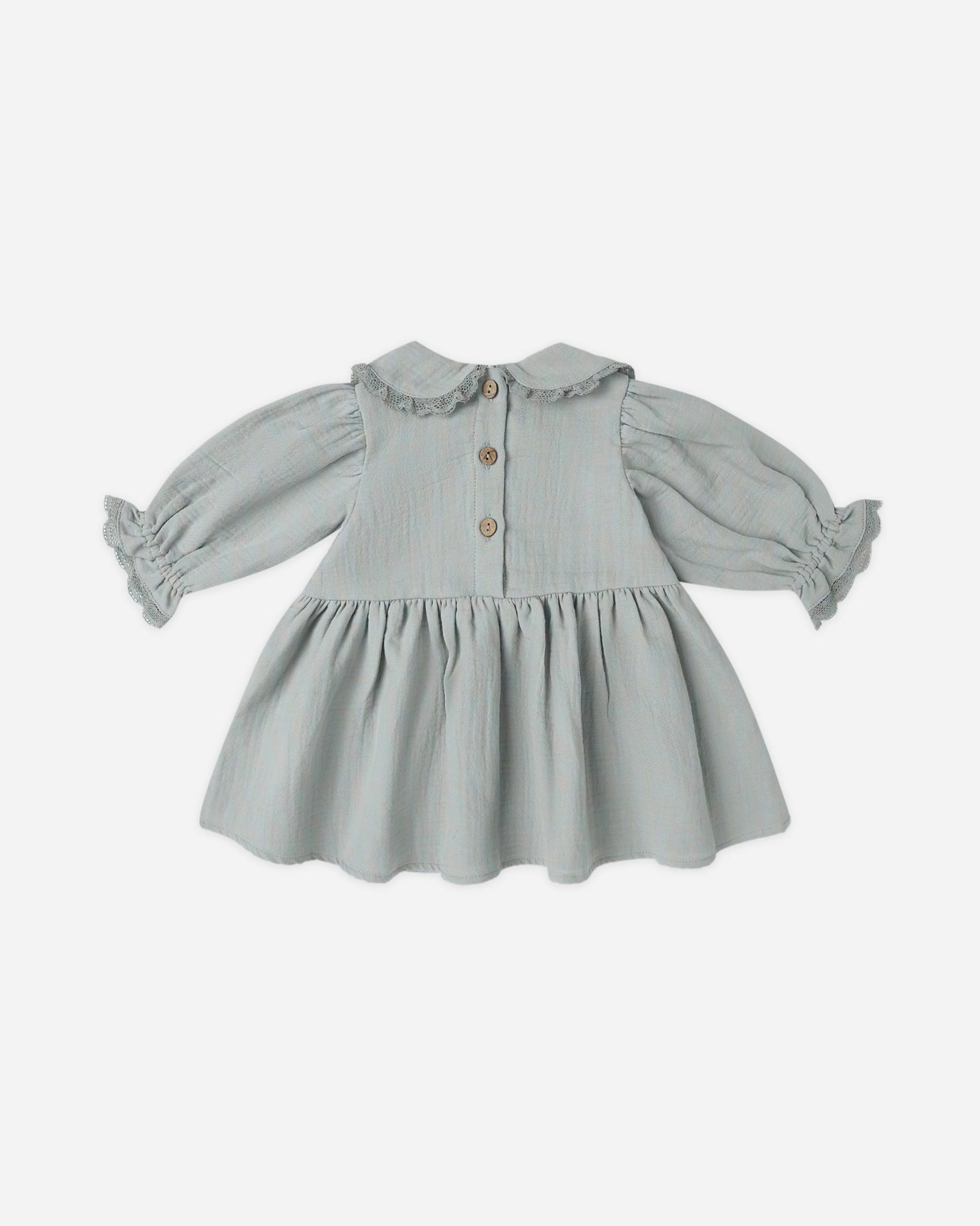 Our Marisol Dress features a Peter Pan collar, patch pockets, and full gathered sleeves—all adorned with delicate lace ruffle trim—and coconut buttons at the back for easy dressing. Coordinating bloomers included with all sizes.