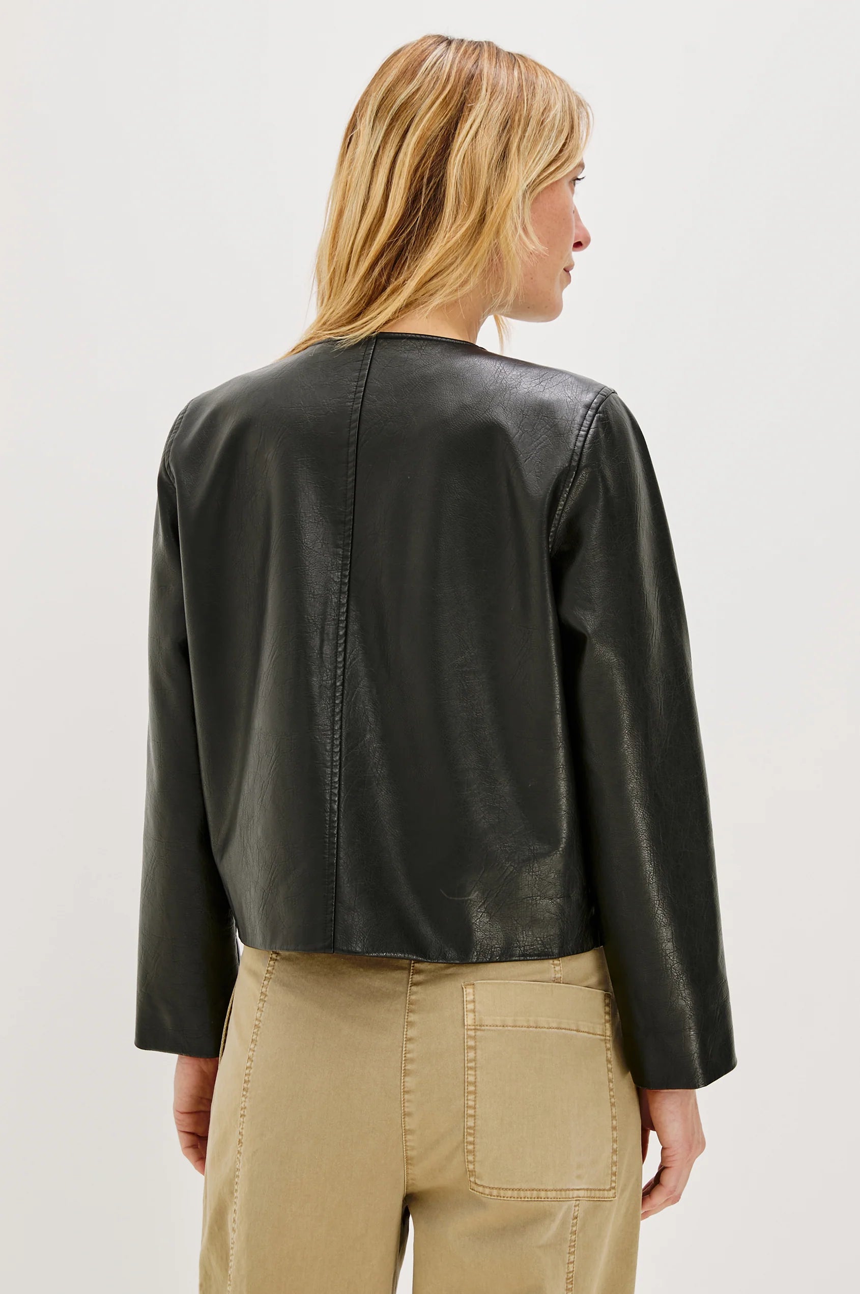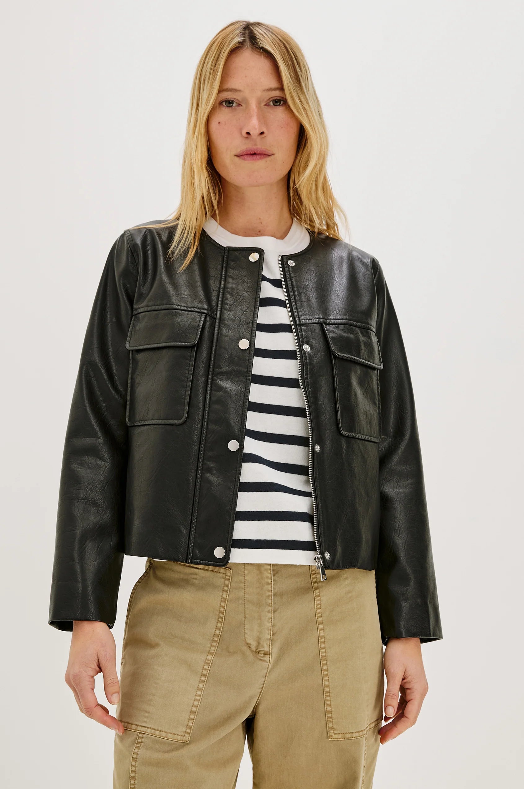 A ‘lady’ style jacket in faux leather. The Inka Jacket features a cropped, boxy fit and classic chest pockets in a tarnished faux leather fabrication.