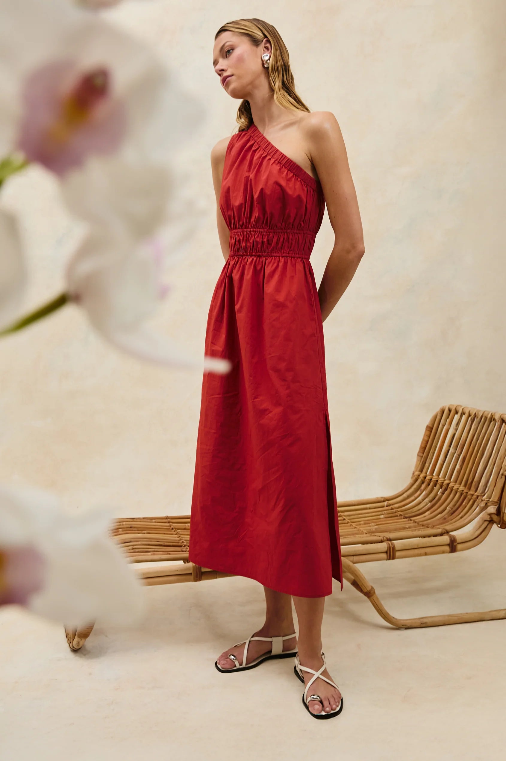 Crafted from lightweight beach cotton, the midi-length Selani offers elevated comfort with a shirred waistband and asymmetrical neckline. It's finished with concealed pockets on the seams and a side slit for ease.