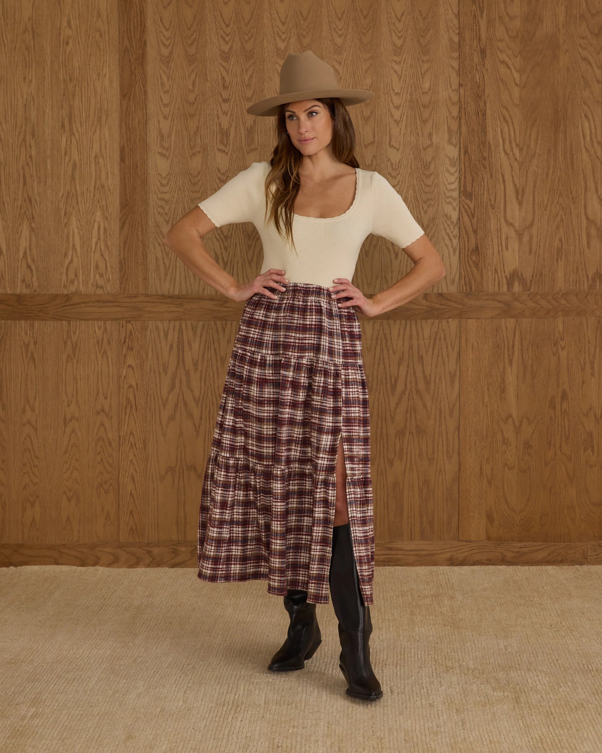 Rylee + Cru Women's Tiered Midi Skirt, Burgundy Plaid