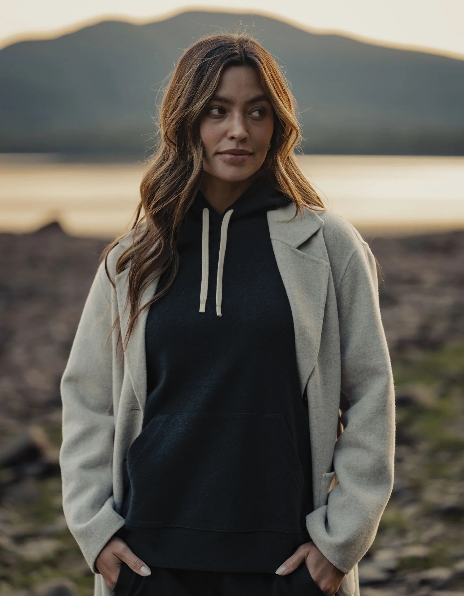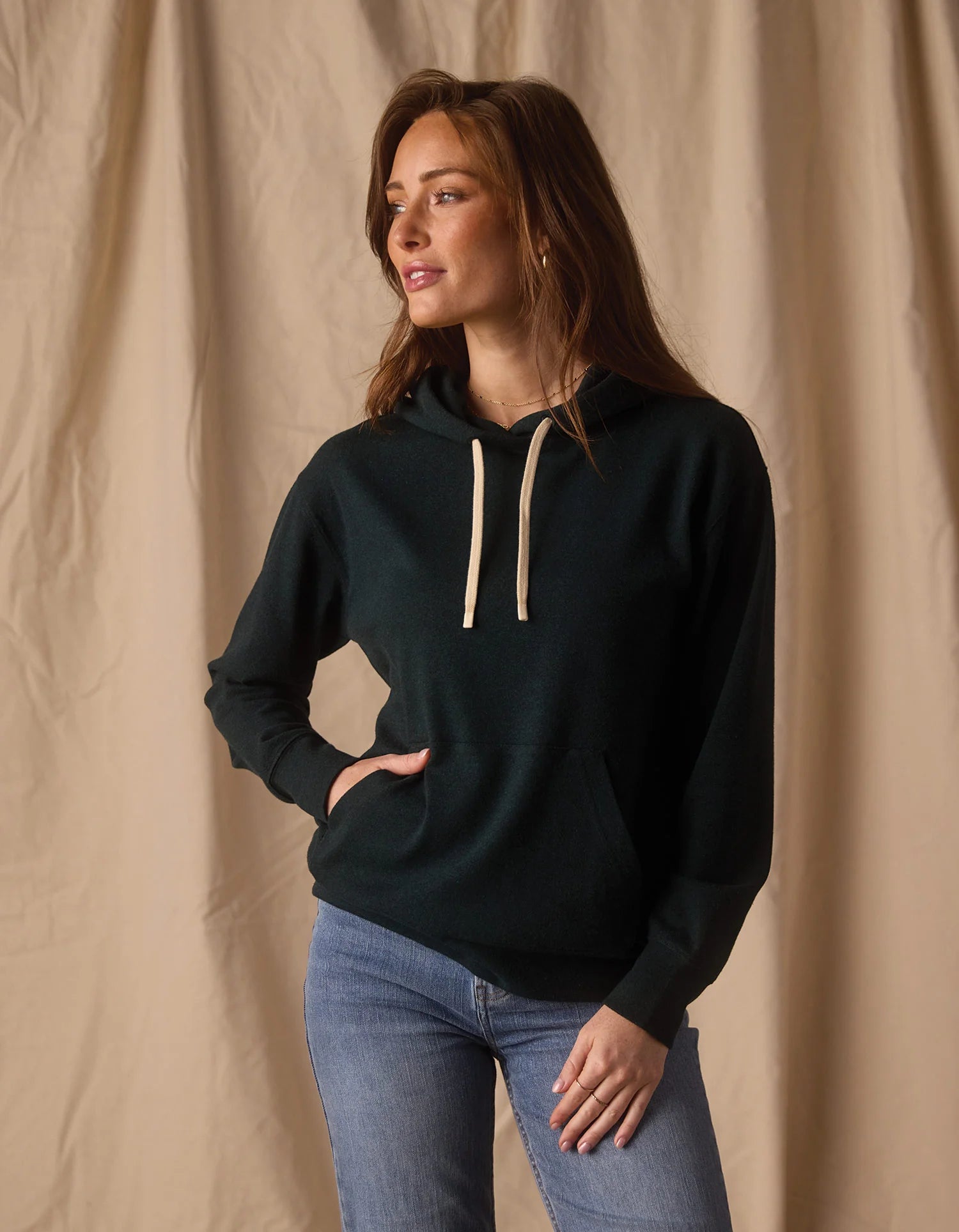 Crafted from our signature and best selling cotton/poly/spandex blend fabric, this hoodie offers unparalleled comfort and all the stretch you need. With a heavier weight and garment-washed finish, it's designed to keep you cozy and warm. This relaxed-fit hoodie hits at the hips, making it a versatile layering piece that effortlessly combines comfort and style for women seeking the perfect blend of fashion and function.